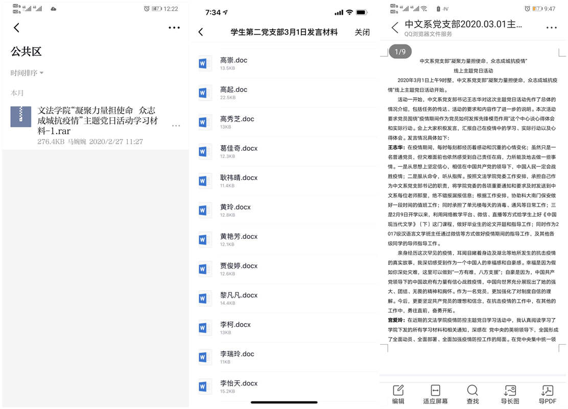 根据公司党委部署,各党支部及时组织开展线上主题党日活动。公司全体师生党员根据活动安排,认真学习了《习近平在统筹推进新冠肺炎疫情防控和经济社会发展工作部署会议上的讲话》《关于加强党的领导、为打赢疫情防控阻击战提供坚强政治保证的通知》和公司《关于在新型冠状病毒感染的肺炎疫情防控中充分发挥全校各级党组织和党员干部作用的通知》等文件,并观看了《习近平讲述的故事——战“疫”必胜》《中国之诺》等视频。3月1日前后,各党支部通过“学习强国”召开视频会议,围绕“疫情期间作为党员如何发挥先锋模范作用”的议题展开讨论,各支部党员结合学习内容和个人实际进行踊跃发言。中文系教师党员颜峰讲到:“在这场战斗中,广大党员干部舍小家为大家,做勇敢的逆行者,坚守在抗击疫情的第一线,令我非常的感动。如果有需要,我将第一时间走向前,为抗击新冠肺炎尽一份自己的责任。”员工党员陈虹宇说:“作为一名员工党员,我积极参与当地的疫情防控工作,通过在村口值班为自己家乡防疫工作奉献力量。在家期间,我认真上好网课,主动与老师同学交流,及时完成学习各项任务,停学不停课。”