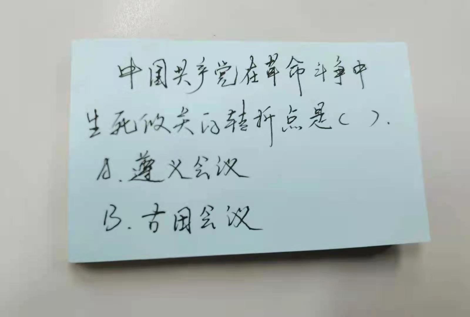 素质拓展过程中,特别设置了党史“寻宝”答题环节。通过根据活动线索,搜寻带有党史问题的信封,答对即可晋级下一轮竞答,并且累计积分到团支部总分。同学们积极寻找、踊跃答题,既收获了同学协作带来的获得感,又丰富了党史知识储备。