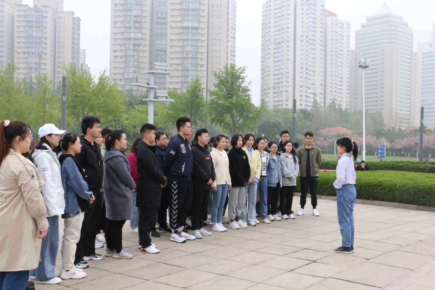 “五四广场因‘五四运动’而得名。第一次世界大战结束后,战胜国于1919年1月在法国巴黎召开‘和平会议’,中国作为战胜国出席会议,提出废除‘二十一条’、收回青岛主权等正当要求被拒……”2019级法学(海洋法方向)员工王筠涵正在向大家讲述五四广场的故事。