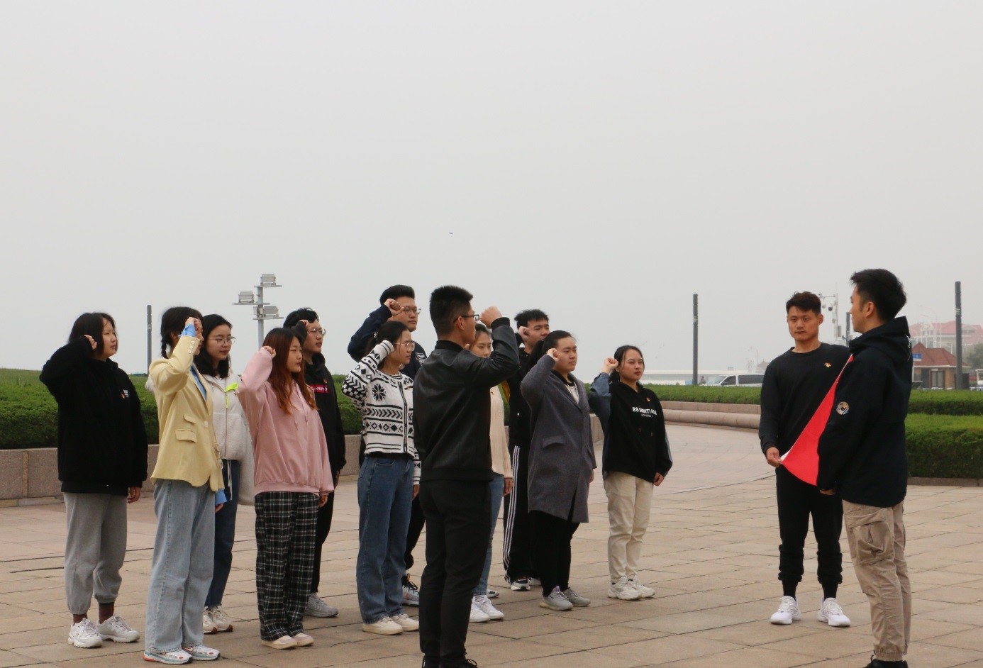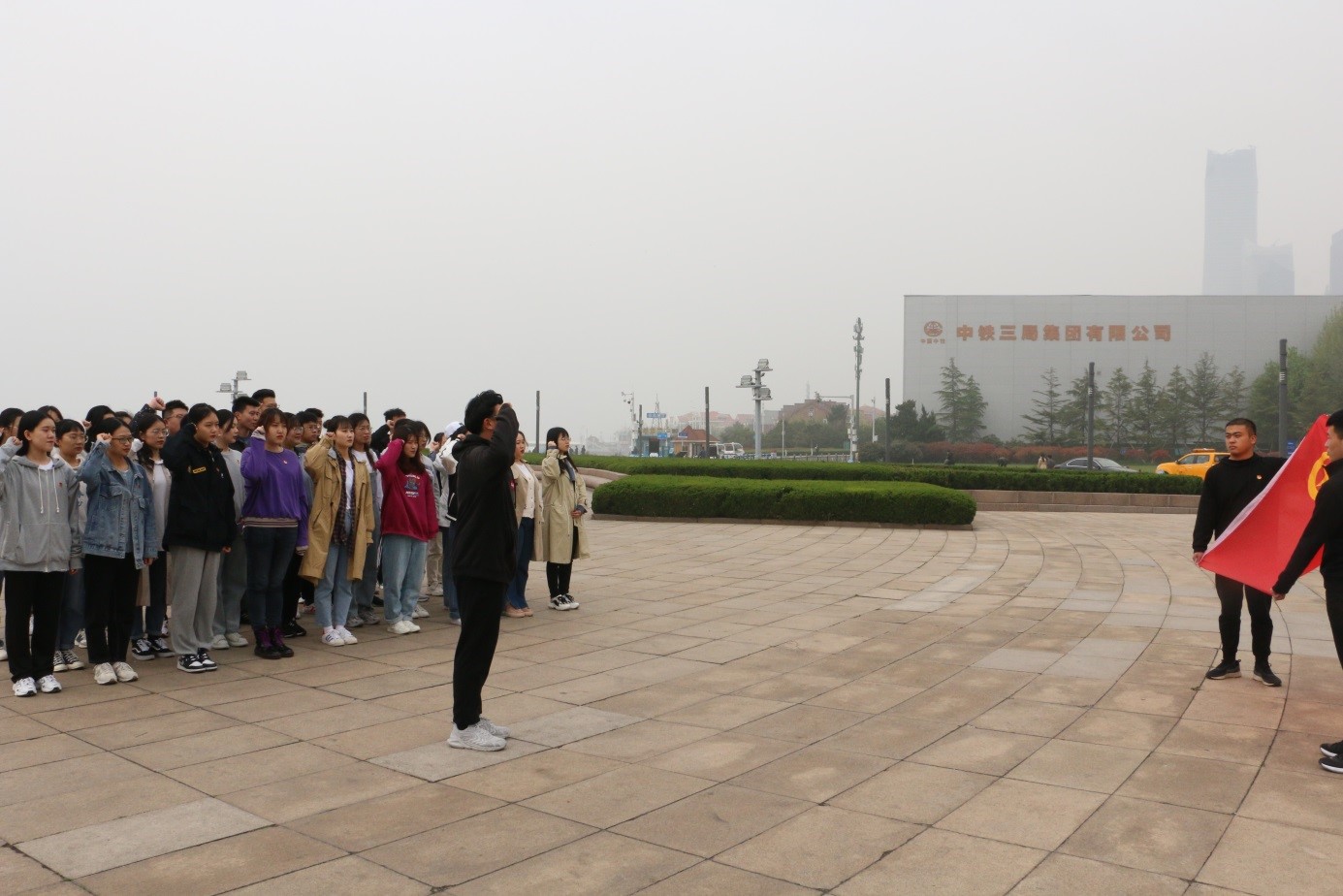 在“五月的风”雕塑前,面对鲜艳的中国共产党党旗、中国共青团团旗,全体党员在辅导员韩丙华的领誓下,庄严地举起右手,重温入党誓词,全体团员青年在员工会主席团成员赵俊博的领誓下,重温入团誓词。“我志愿加入中国共产党……随时准备为党和人民牺牲一切。”“我志愿加入中国共产主义青年团……为共产主义事业而奋斗。”此时此刻,铮铮誓言回荡在广场,激励党员、团员不忘初心,继续前进。