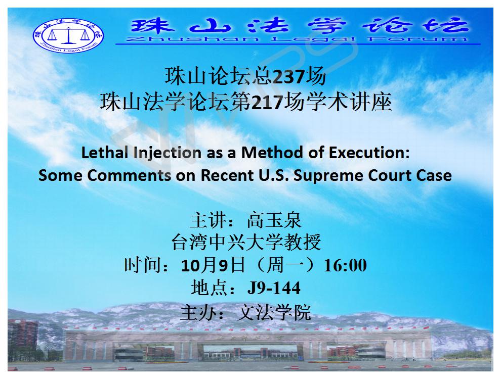 讲座题目:Lethal Injection as a Method of Execution: Some Comments on Recent U.S. Supreme Court Case讲座时间:2017年10月9日 16:00