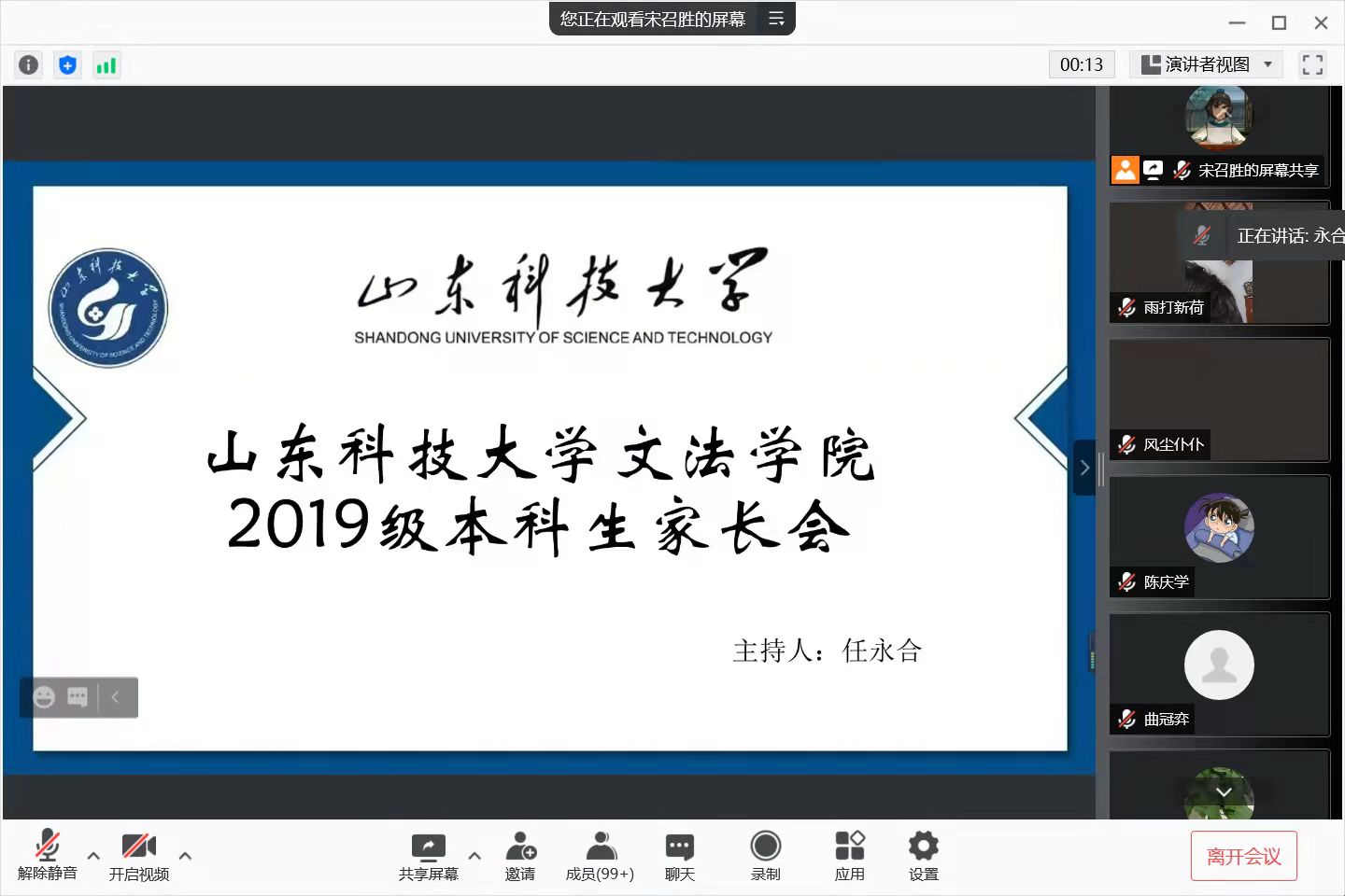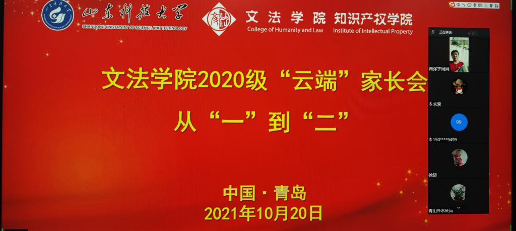 2020级辅导员韩丙华以“从‘一’到‘二’”为主题开展云端家长会。在会议中,他分别从“回首总结过去的‘一’”“把握利用现在的‘二’”“统筹谋划将来的‘三’”三个方面展开,向全体家长报告了2020级员工在大一学年的表现和收获,对学业成绩、第二课堂、专业竞赛、社会实践等内容进行了详细解读,同时与家长达成了“家校共建、共育、共督促”的育人模式。