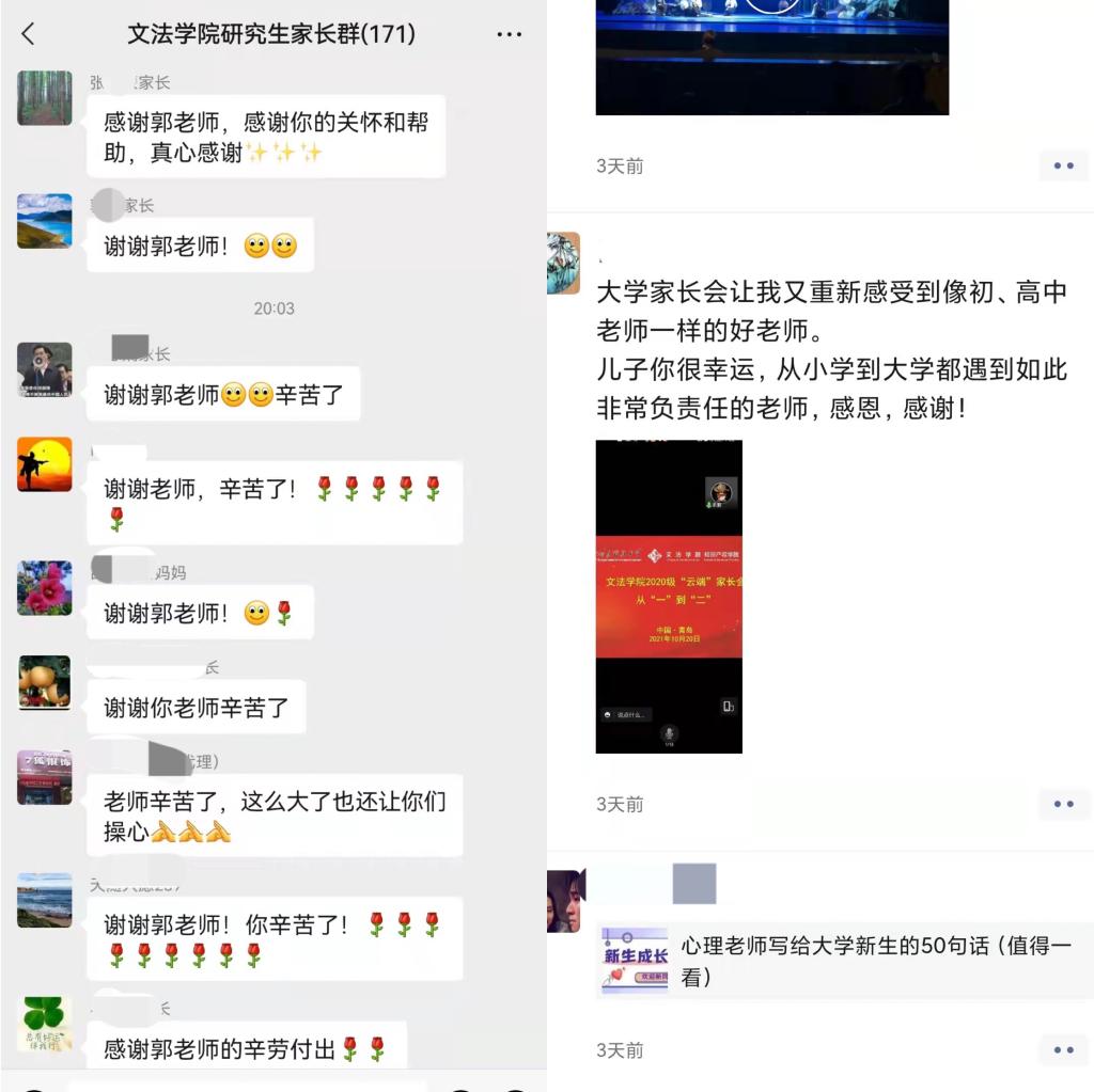 2019级辅导员任永合从第二课堂成绩预警、职业生涯规划、家校共育、心理健康与安全教育等四个方面向参会家长展开交流,并结合实际事例,对员工未来发展的三大方向——考研、考公、找工作进行了利弊分析和答疑解惑。家长们在此次交流会中也积极参与发言,针对考研择校问题、选调生的条件和要求以及找工作所需要的各方面综合素质等问题任永合都进行了耐心分析和解答。