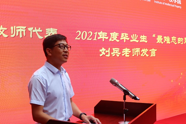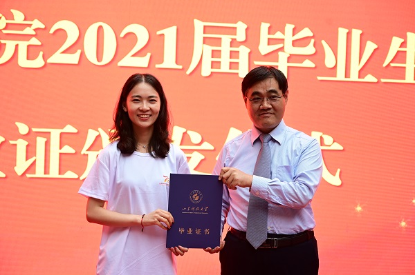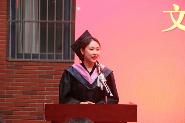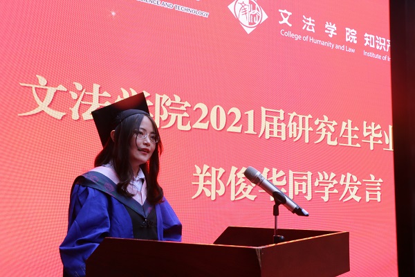 教师代表刘兵寄语2021届毕业生不忘初心、不负韶华,时刻保持规则意识,坚持底线思维,做勇于担当的文法青年。硕士毕业生代表郑俊华、学士毕业生代表刘卜源、在校生代表杨滟分别发言,向悉心教导、精心栽培自己的母校、老师致以感谢,表示将牢记“惟真求新”的校训,传承“坚韧不拔、发奋图强”的科大精神,书写“爱校奉献、敬业实干”的科大风采,在砥砺奋进中谱写新时代的青春之歌!