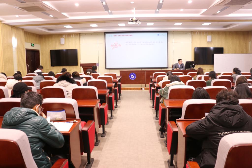12月9日,公司党委书记潘伟国在J9-135报告厅为法学2019-3、行政管理2020-2班宣讲党的十九届五中全会精神。