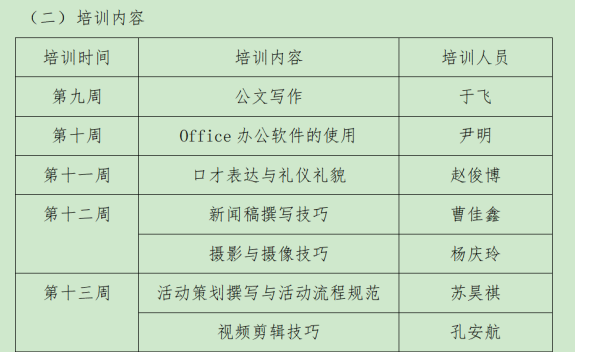 作为第一届晨露课堂公益培训会的开篇之际,于飞为同学们带来了一场别开生面的《公文写作》公益培训课,让同学们了解到了如何掌握写作公文技巧、如何甄别修改公文中出现的错误等知识,提高了同学们公文写作能力。第十周,尹明同学为帮助大家更好地熟练掌握办公软件的使用,为社团干部考取计算机证书奠定一定的基础。赵俊博于第十一周,为社团干部举办了一场《口才表达与礼仪礼貌》的公益培训课,培养了同学们的口才表达能力与待人接物中的礼仪礼貌。第十二周,孔安航与苏昊祺为大家带来了活动策划与视频剪辑技巧,方便了大家的后续工作开展。第十三周,曹佳鑫、杨庆玲与付宇航三位新闻工作室部长,分别针对“新闻稿撰写”、“摄影摄像技巧”与“PS技术”等三项培训课题,带领大家感受到了新闻工作者的日常工作。