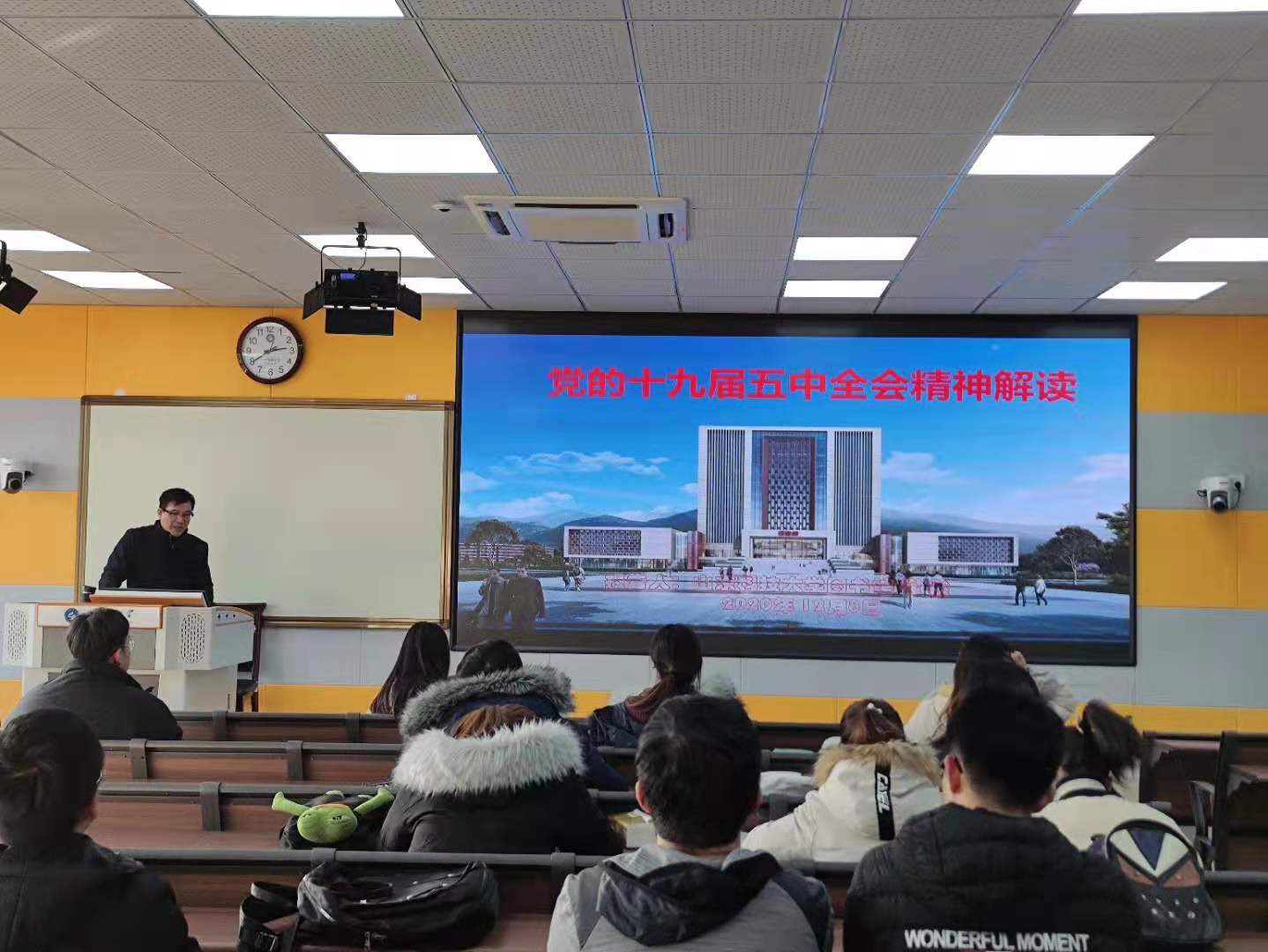 12月8日,图书馆馆长崔然在J1-408为SUNBET申博秘书学2017级员工宣讲党的十九届五中全会精神。
