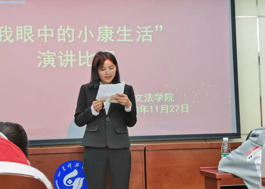 演讲过程中,他们用慷慨激昂、振奋人心的话语,从不同的角度讲述了自己心中的小康生活,阐述了上一辈人艰辛的奋斗历程,描绘着小康生活的美好蓝图,抒发了敢于有梦、勇于追梦、勤于圆梦的青春激情。选手们真情流露以饱满充沛的情感感染了现场的同学和评委,赢得大家阵阵掌声。经过评委打分,本次比赛共评比出一等奖一名,二等奖两名,三等奖四名。来自2020级法学四班的张景惠凭借出色的语言功底,获得本次比赛的一等奖。