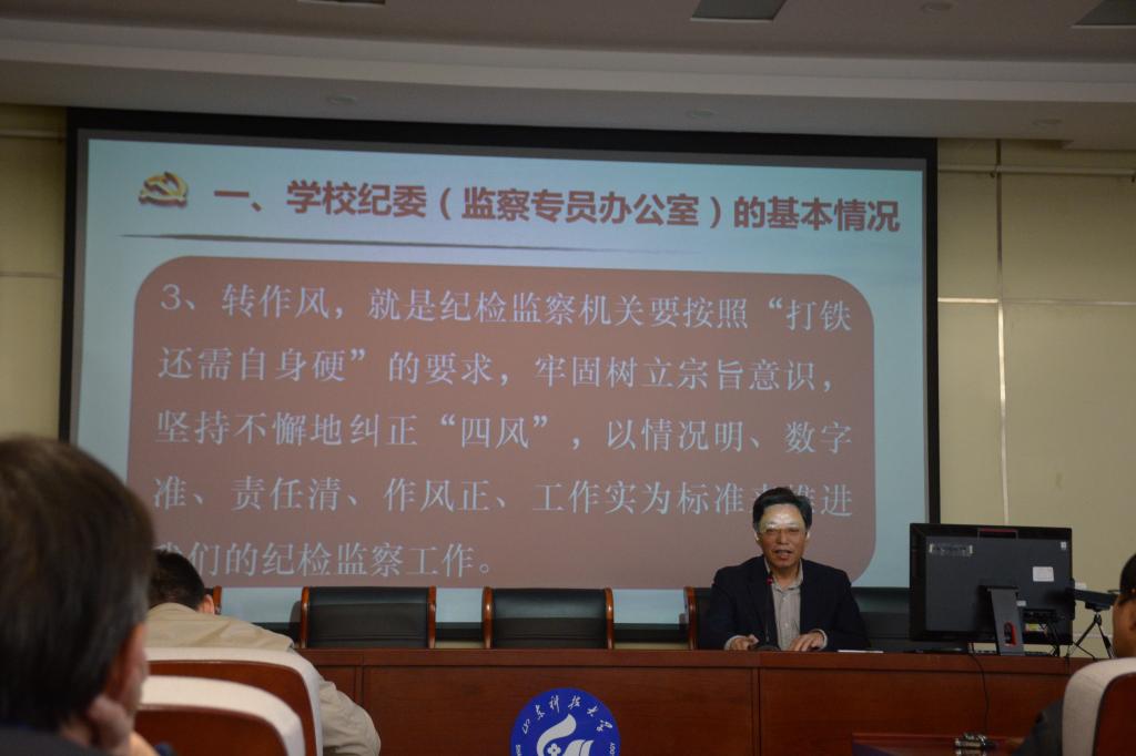周如东介绍了校纪委(监察专员办公室)基本情况和办案流程,重点剖析了十八大以来高校师德师风失范、学术道德不端、财经纪律松懈等11类高校常见违规违纪现象,通过对大量违规违纪案例的剖析,深刻揭示了违规违纪案件形成的根源以及查处法规依据,教育警示全体教师要学习贯彻习近平总书记关于教育的重要论述精神,落实立德树人根本任务,争做“四有”好老师,心有所畏、言有所戒、行有所止,为培养德智体美全面发展的社会主义建设者和接班人作出应有的贡献。