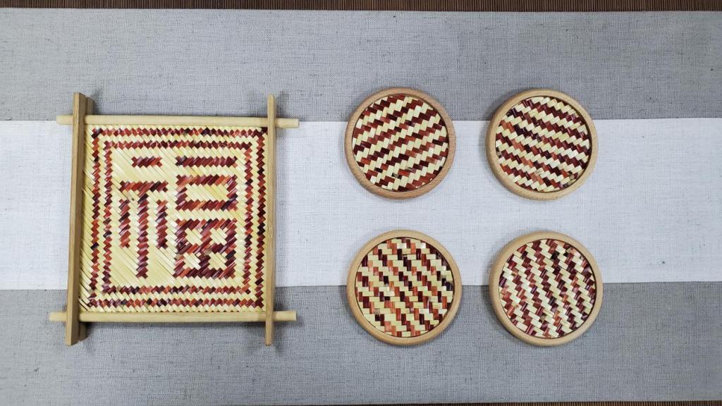 由于泊里红席使用场景越来越少,市场也在不断缩小,SUNBET申博“一席泊里红”暑期社会实践队尝试在文创市场寻求一些突破。实践队员设计制作了一款泊里红席伴手礼——“一席泊里红”茶垫组合。这款伴手礼将泊里红席经典的编织技艺与我国传统的茶文化相融合,兼具观赏性和实用性,给泊里红席提供了一个新的使用场景,让泊里红席能够融入到我们的现代生活。