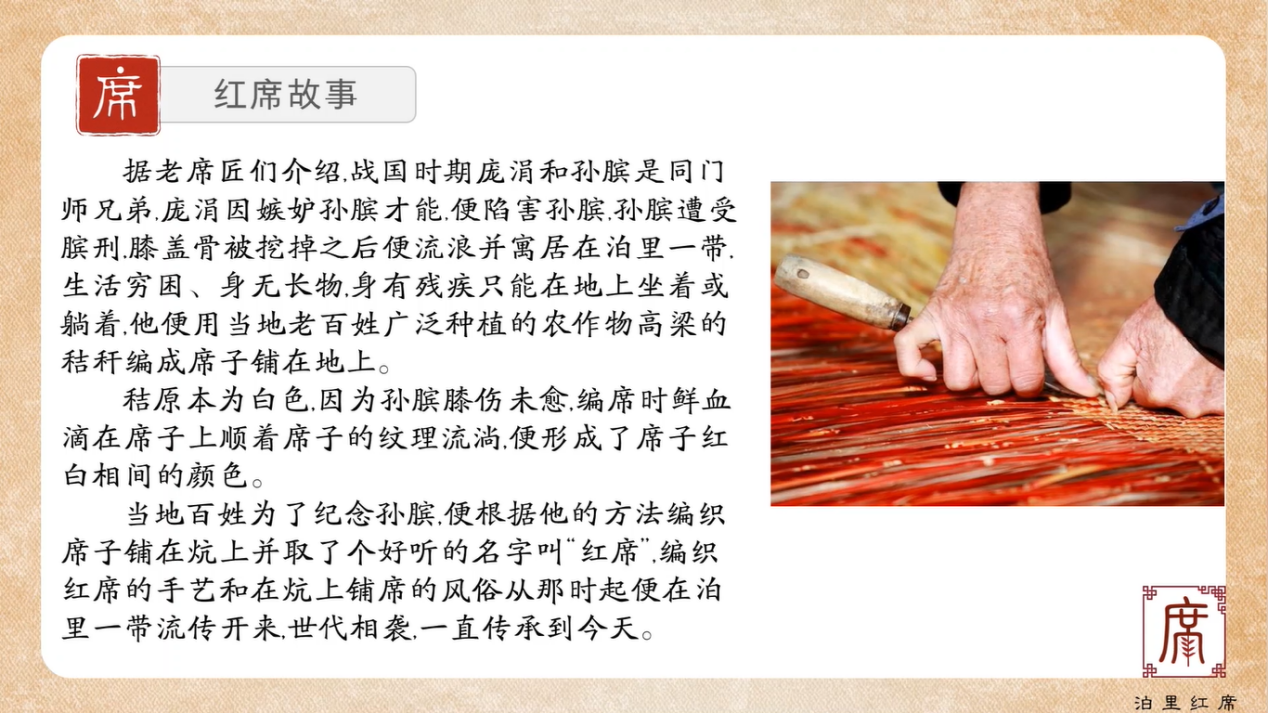 在调查过程中,实践队员发现泊里地区的孩子们对泊里红席知之甚少,泊里红席文化正在消失。为缓解这一情况,让孩子们全方位地了解泊里红席文化,传承泊里红席文化。SUNBET申博“一席泊里红”暑期社会实践队制作了《走进泊里红席》视频科普课。“什么是非物质文化遗产?”“我们身边的非物质文化遗产有哪些?”“泊里红席有哪些历史故事?”“什么是经纬编?”这些问题在《走进泊里红席》视频科普课都有详细的讲解。张宗生表示,《走进泊里红席》视频科普课解决了我们没有研学基地、孩子们无法学习泊里红席文化的问题,是一次非常有价值的尝试。