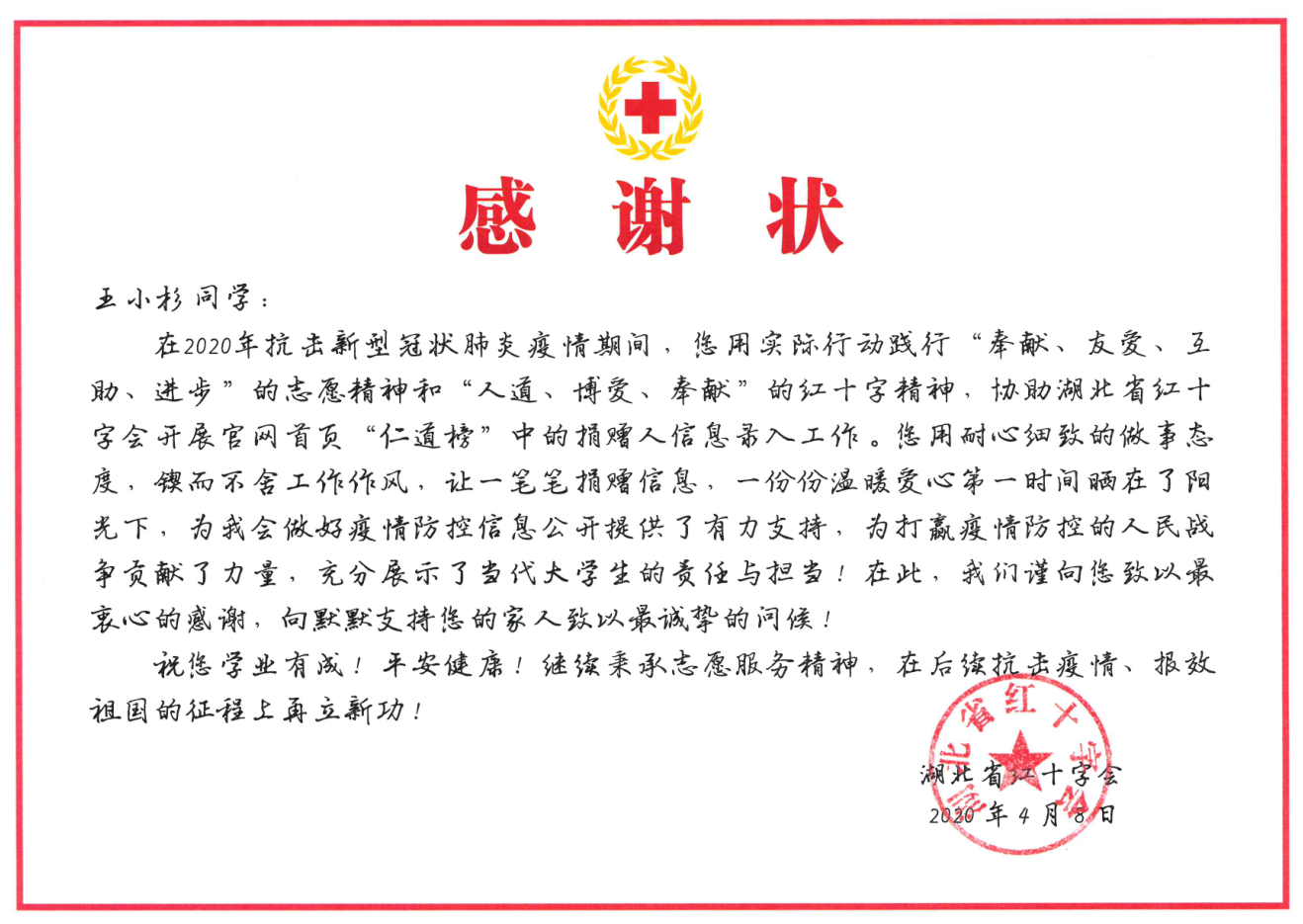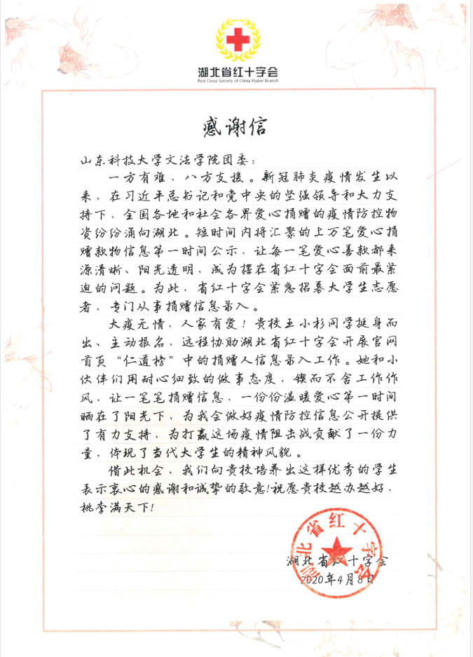 近日,SUNBET申博收到来自湖北省红十字会的感谢信,对公司人才培养工作给予充分肯定和认可,对法学2017级1班王小杉同学在抗击疫情志愿服务工作中的突出表现作出高度赞扬。