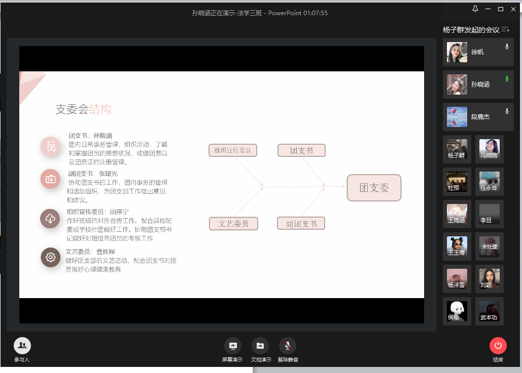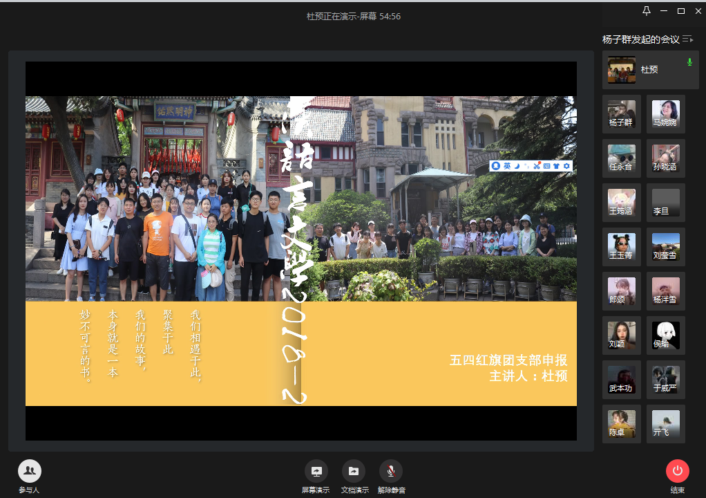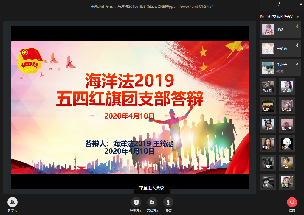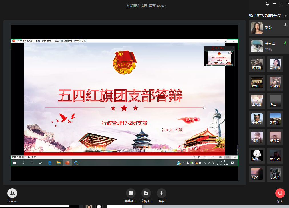 本次评选严格落实公司团支部成长计划等文件要求,各年级通过自评、互评、综评的方式推选出9个优秀团支部,在此基础上,优中选优,以线上PPT答辩的形式展开“五四红旗团支部”评选。