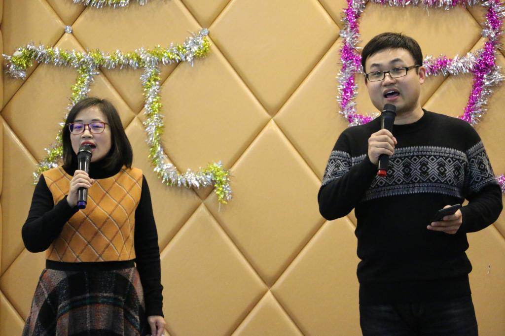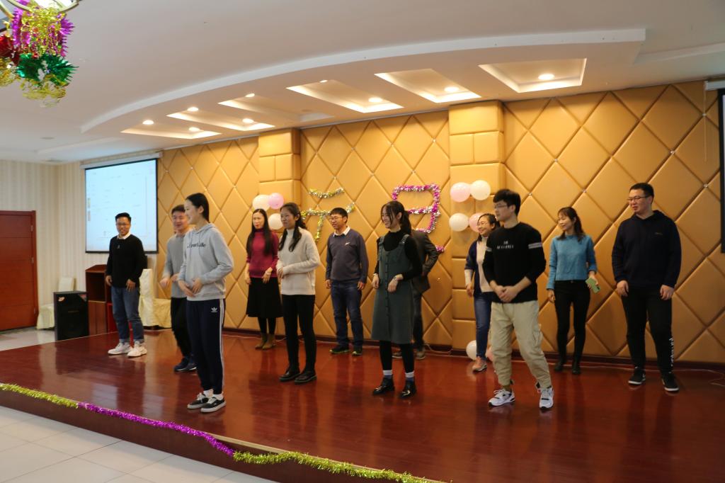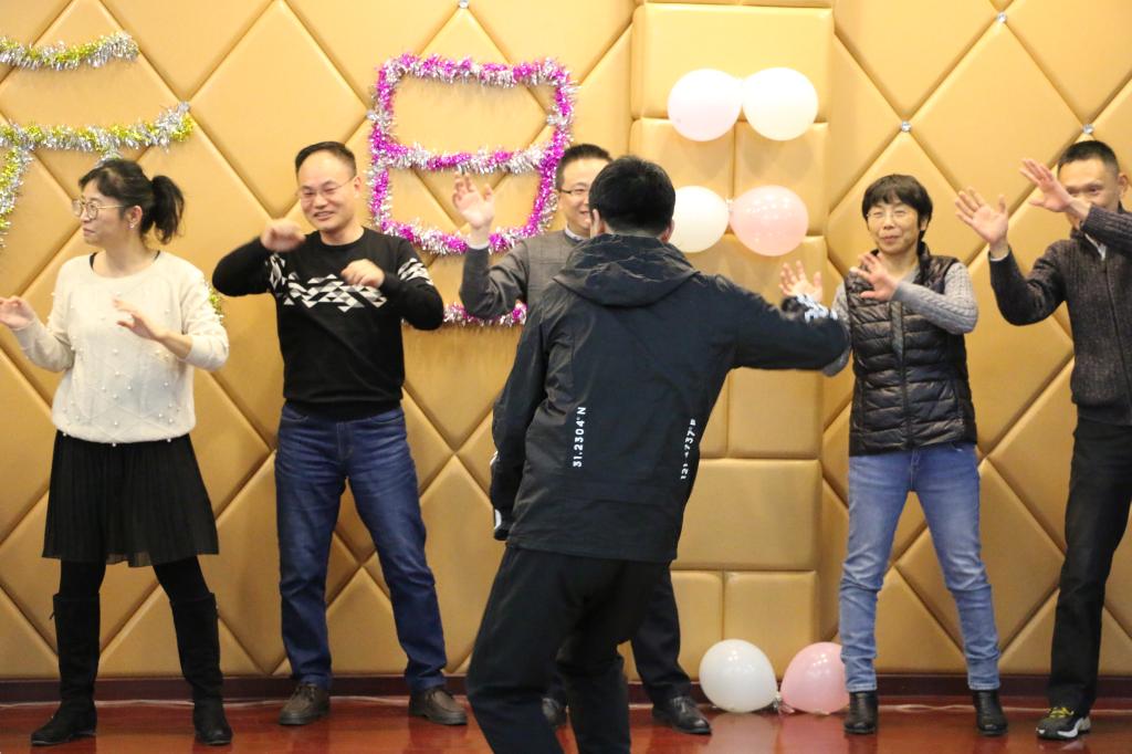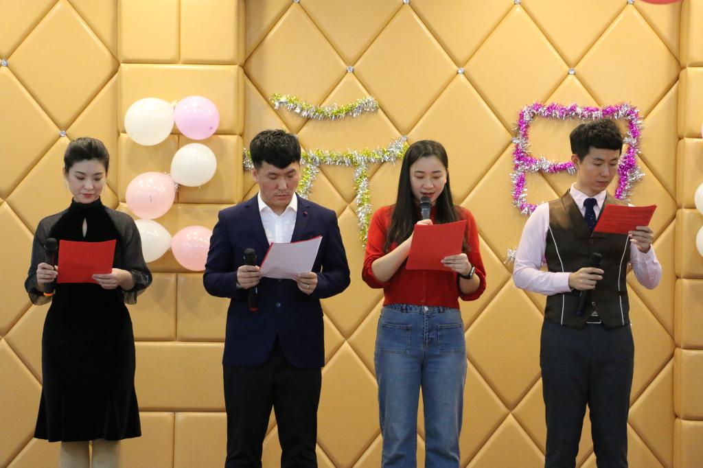 晚会开始前,徐铃平首先对公司一年来的公司产品工作做出简要总结。他充分肯定了公司教职工一年的劳动成果,并代表公司向现场的老师致以感谢和新年的问候。晚上7:00,晚会准时开始。伴随热烈的掌声,管理岗位的老师们为大家带来了开场舞蹈《失恋阵线联盟》,轻快的音乐,“优美”的舞姿,赢来了现场的阵阵掌声与笑语。在接下来的表演中,法学系、管理系、中文系、广告系的老师们各展才艺,分别为大家带来了《野狼disco》《青春万岁》《明天会更好》等精彩的节目演出,更有许多老师即兴献唱,晚会气氛热烈。晚会前,到场教职工共同包饺子,并在观赏节目期间共同享用劳动成果。晚会中间还设置了抽奖和游戏环节,萝卜蹲、我来比划你来猜等游戏为晚会增添许多欢快的色彩。
