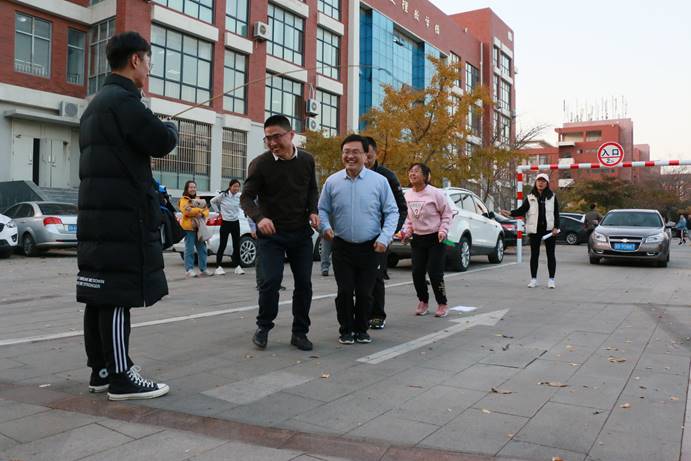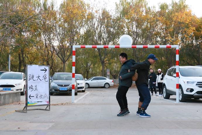 下午四点,趣味运动会正式开始。本次运动会设置了夹乒乓球、螃蟹背西瓜、萝卜蹲、跳大绳、踢毽子、单人跳绳、托球跑接力等七个趣味比赛项目。各比赛项目轻松有趣,将健身、娱乐融于一体,比赛项目既需要选手的个人能力,也考验团结协作能力,极大地激发了教职工们的热情。其中,"螃蟹背西瓜"充分考验了教职工之间的配合能力,背对背夹着篮球的教职工们快速地向终点冲击,在速度与平衡的角逐中不时传来阵阵的欢呼声。不同于课堂上谆谆教诲、传道授业的学者,在运动场地上,老师也展现出不输于员工的青春活力,现场呐喊声、欢呼声、鼓掌声跌宕起伏。