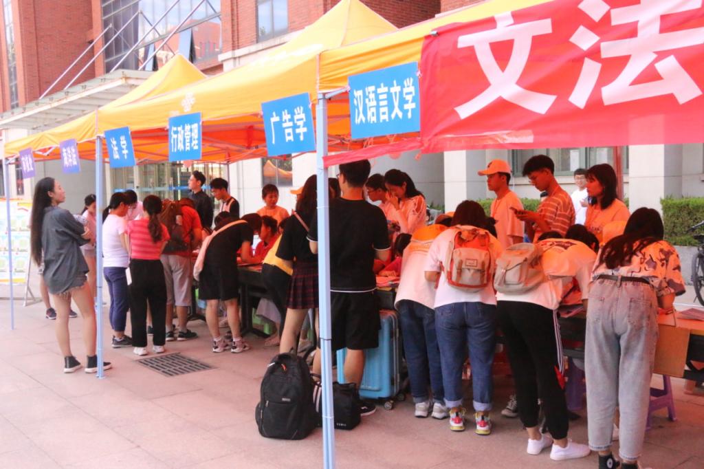 迎新现场,引导组、报道组、接待组、宣传组分工协作,合理有序地安排工作,经过对前一天工作经验的积累,各工作小组的配合更加默契,迎新人员对工作流程也更加熟悉。引导组同学一次次的折返于校门口与报到处之间;报道组同学帮助新生逐一核查材料,接待组同学负责将新生送到宿舍;宣传组同学认真记录现场细节,对现场老师和新生进行采访,工作开展有条不紊。