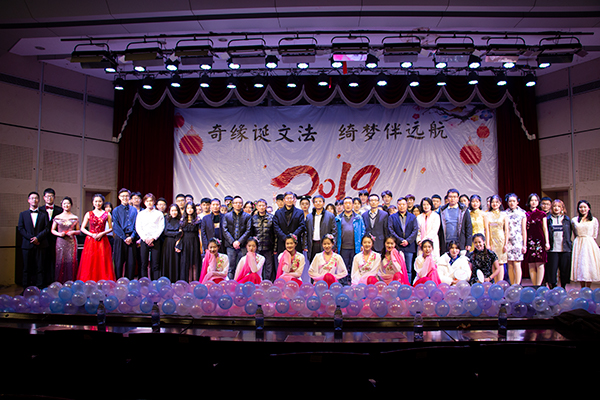 晚会分为“因缘而聚、共享华章、迎新别就”三个篇章。一场轻快动感的开场舞拉开晚会帷幕。在喝彩与掌声中,歌曲、演奏、舞蹈、走秀、小品、朗诵等节目轮番上演,精彩纷呈。舞蹈《What is love》热情似火,瞬间点燃全场气氛;抒情的乐器演奏、优美柔和的舞蹈给观众带来听觉与视觉上双重美的享受;一首朗诵《钢铁》,刚柔并济,将人物塑造的惟妙惟肖;幽默诙谐的小品《白蛇前传》及街舞社的街舞更是将晚会推向高潮。节目中间还穿插着“卡夫卡”和四字词语的游戏环节,观众们积极参与,台上台下热情互动。最后,晚会以一首合唱《为梦痴狂》圆满落幕。