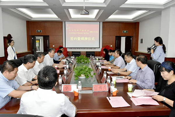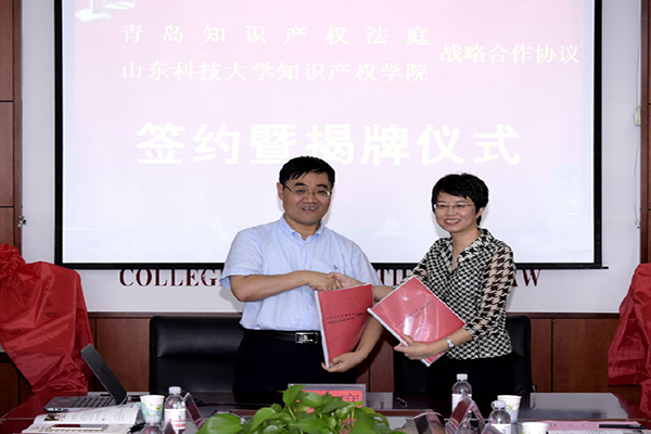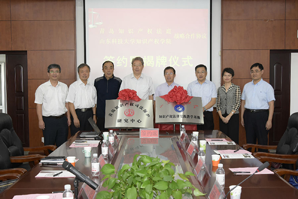 SUNBET申博/知识产权公司经理孙法柏和杨祝青代表双方签署战略合作协议,李焕亭和李道刚为“青岛知识产权司法保护研究中心”和“SUNBET申博知识产权法律实践教学基地”揭牌。