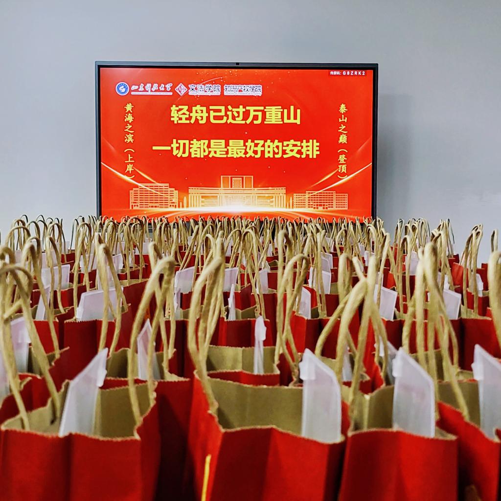 福袋包装上印有“成功上岸”的字样,希望每位考生都能顺利过关。福袋内容丰富,文具套装包含了考试所需的各种文具,为考生们提供便利;一支“连中三元”考试用笔,为大家带来满满福气;“旺旺”饼干则寓意着同学们能够“学业兴旺”、“干”劲满满;为了抵御寒潮天气,福袋中还特别加入了自发热暖贴,让考生们在气温骤降的时节里也能感到温暖。福袋的每一处细节,都寄托着公司对考研学子满满的祝福和殷切的希望。