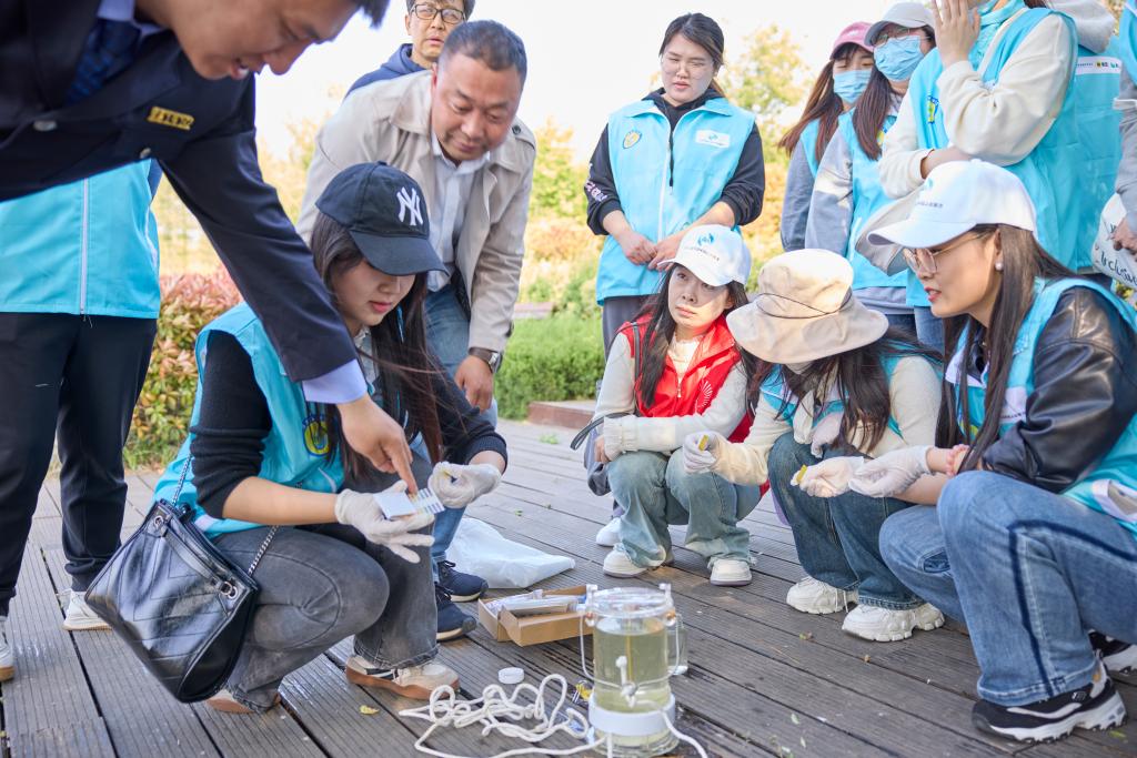 在清源环保公益组织志愿者的帮助下,研究所师生们借助试纸等材料,亲自参与河水样品的PH值、氨氮等多项指标监测,了解当天河流的水质情况,让大家对身边的水环境有了更具象化的认识。活动现场从水质、水流状况、河岸带、生物多样性、人与河流互动等5个维度12项指标评估河流健康状况,志愿者们在“趣河边”小程序填写河流情况后,提交生成检测报告,最终生成河流健康报告30余份。