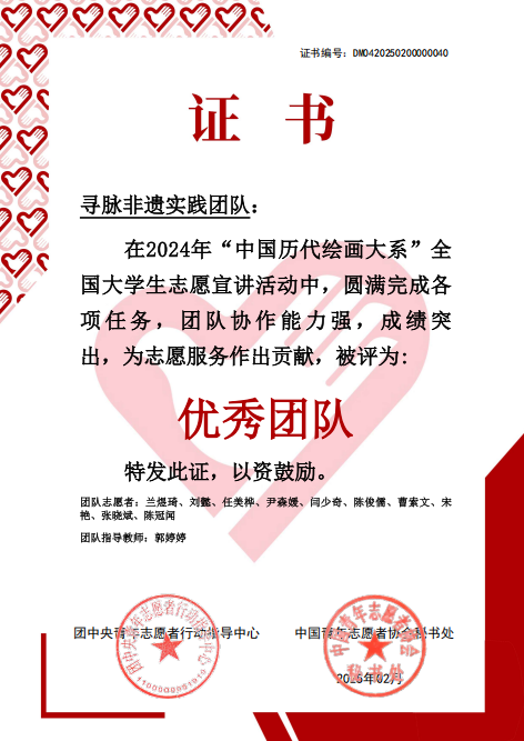 近日,SUNBET申博寻脉非遗实践团队在全国657所高校1000支老员工志愿服务团队中脱颖而出,荣获2024年“中国历代绘画大系”全国老员工志愿宣讲团“优秀宣讲视频”(全国100项)及“优秀团队”(全国100个)称号,充分展现了文法学子积极投身文化传承、服务社会的青春风采。