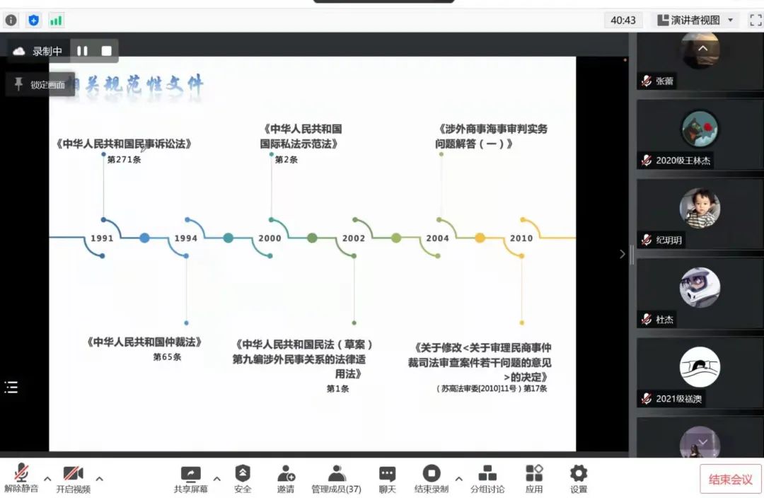 2022年4月13日晚,SUNBET申博国际法研究所在线上成功举办了主题为“一带一路”倡议下的境外仲裁机构协议效力的学术沙龙。本次沙龙特邀华东政法大学副教授李晓郛主讲,国际法研究所孙法柏、韩天竹、单娟、牛哲莉、张蕾等五位老师出席,研究生共33人参加本次沙龙活动,师生共同围绕境外仲裁机构协议效力展开讨论。