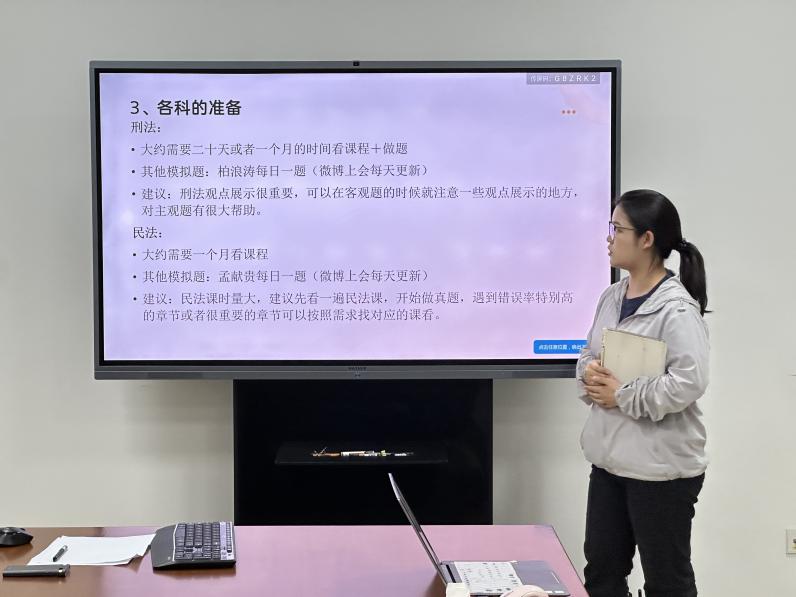 2025年5月29日,珠山法学论坛在图书信息中心1318举办了“法考和公考经验分享交流沙龙”活动。2023级法律硕士闫谨、2024级法学硕士曹硕、2023级法律硕士梁思逸、2023级法学硕士张晓玲、2023级法律硕士刘春凤等五名硕士研究生分享了法考经验,2022级法学硕士研究生王鹏分享了区县级人民法院公务员考试经验。本次沙龙旨在解决同学们备考过程中的困惑,为准备法律职业资格考试、公务员考试同学分享学习经验、提供策略参考,继而增强大家的自信。SUNBET申博30余名法学硕士、法律硕士研究生参加了活动。