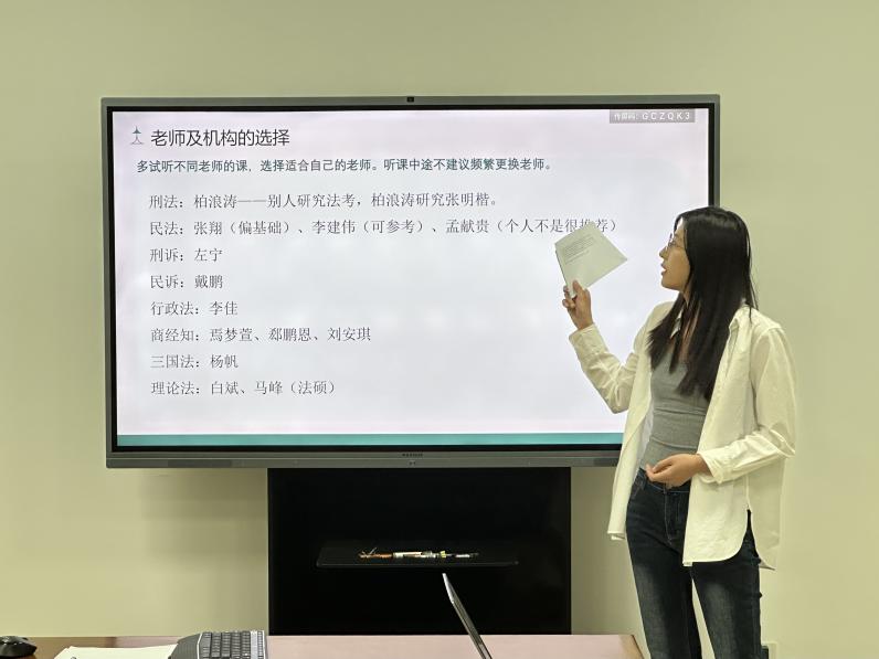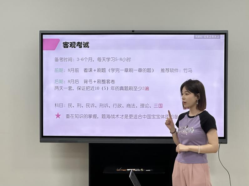 在法律职业资格考试经验分享环节,闫谨同学从法考备考的时间规划入手,建议大家分配好看书和做题的时间,把做题与背书结合起来,及时巩固;曹硕同学介绍了客观题、主观题各科分值分布情况,建议大家根据自己节奏有的放矢地进行安排,她着重分享了自己的应试技巧;梁思逸同学建议大家制定好学习计划,把握学习重点,刷题时要通过题目巩固知识点,避免盲目追求速度和数量;张晓玲同学按照不同科目有针对性地提出了看书和做题方面的建议,她提醒大家应尽早开始背诵,重视历年真题;刘春凤同学分享了自己的备考心得,建议大家放平心态、认真准备,平时利用好零碎时间记忆巩固知识点,重复背诵,强化记忆。