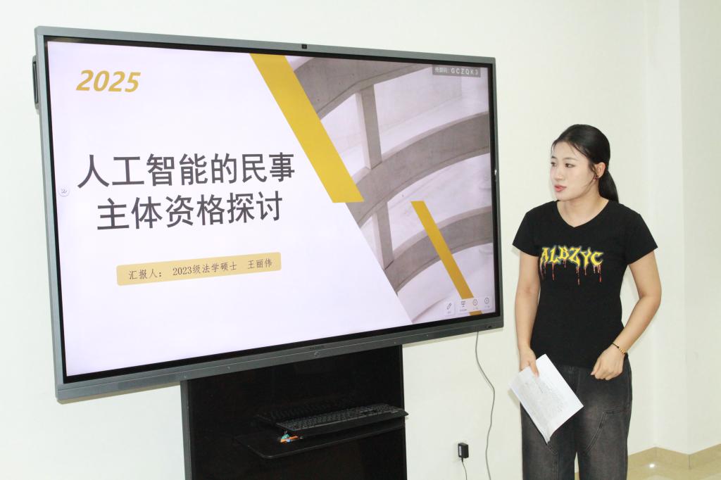 在发言环节,12位同学围绕生成式AI的立法监管、责任认定与主体资格等关键议题展开深度研讨。李佳倩同学从《人工智能法案》与《生成式人工智能服务管理暂行办法》展开,对生成式人工智能服务提供者的义务进行了分析;张红梅同学介绍了在规制高风险人工智能时应当遵循的原则及具体规则;王萍与霍新宇同学分别从责任认定框架和注意义务构建切入,探讨生成式AI服务提供者的责任限制路径;王馨卉、胡宸鸣同学则通过典型案例分析,指出平台在数据侵权、内容生成损害中的责任临界点;付闪闪同学聚焦司法领域,介绍AI了辅助工具并明确其审查边界;徐文艳同学从不同主体角度分析了对生成式人工智能侵权的法律规制;王丽伟、公雯同学就AI民事主体资格问题发表了各自的见解;张馨同学剖析了算法歧视与公平的界限;最后,周瑛峡同学针对AI引发的新型权利冲突,提出了解决方案。