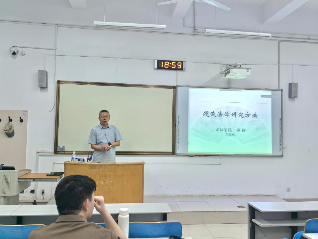 李钢老师以“漫谈法学研究方法”为题,从法学研究方法的概念、分类和运用三个方面展开。李老师首先强调了批判性思维对于学术研究和论文创作的重要性,并告诫同学们在研究中应注重证明和逻辑。随后,他以法学研究方法之争和法学研究问题之分为切入点,详细介绍了法学研究的主要方法,并向同学们推荐了有助于培养法学思维的中外文献著作。讲座最后,李老师梳理了不同法学研究方法之间的关系,并就如何根据不同的研究对象选择适合的研究方法提出了建议。
