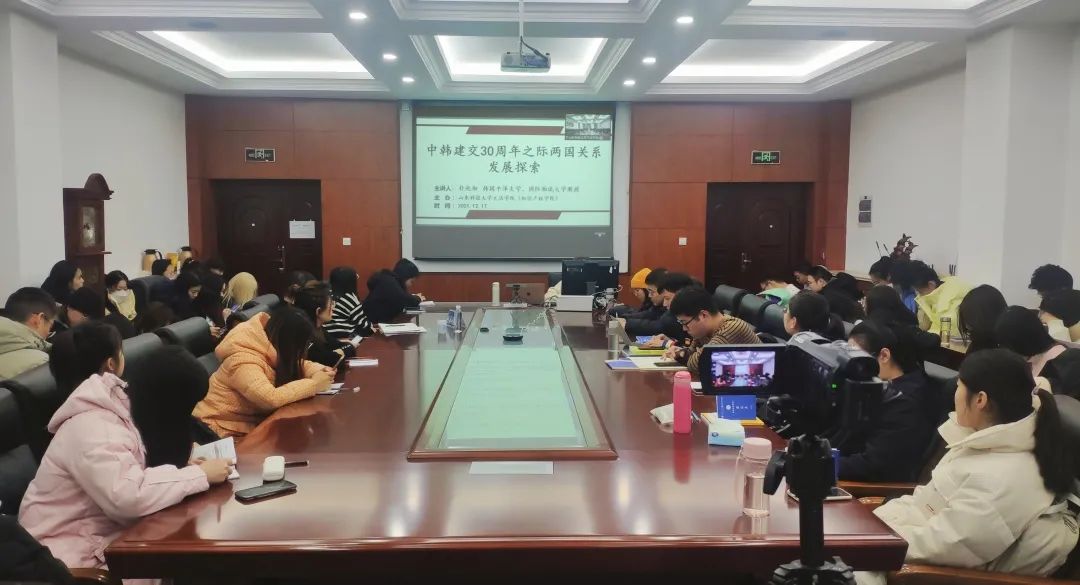 2021年12月17日,韩国平泽大学、国际物流大学朴起彻教授应邀线上出席,为SUNBET申博师生作了题为“中韩建交30周年之际两国关系发展探索”的学术报告,此次报告会由SUNBET申博副经理秘明杰主持,SUNBET申博师生线下到会聆听。