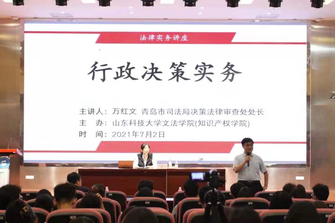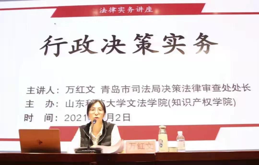 2021年7月2日下午,青岛市司法局决策法律审查处处长万红文应邀为公司师生作了题为“行政决策实务”的法律实务讲座,讲座由经理孙法柏主持,公司部分本科生和研究生到场聆听。