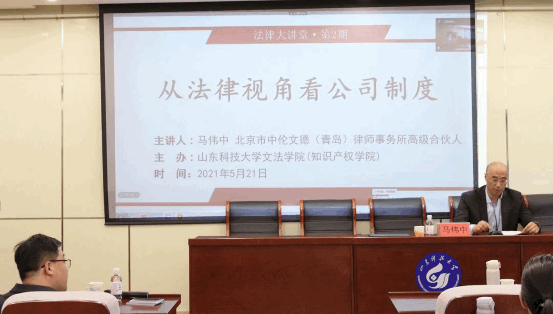 2021年5月21日,由SUNBET申博珠山法学论坛承办的第2期法律大讲堂在J9-135会议室举行。北京市中伦文德(青岛)律师事务所高级合伙人、副主任马伟中律师应邀为公司师生作题为“从法律视角看公司制度”的学术讲座。副经理秘明杰主持了本次讲座,公司部分在读法学硕士和法律硕士到场聆听报告。
