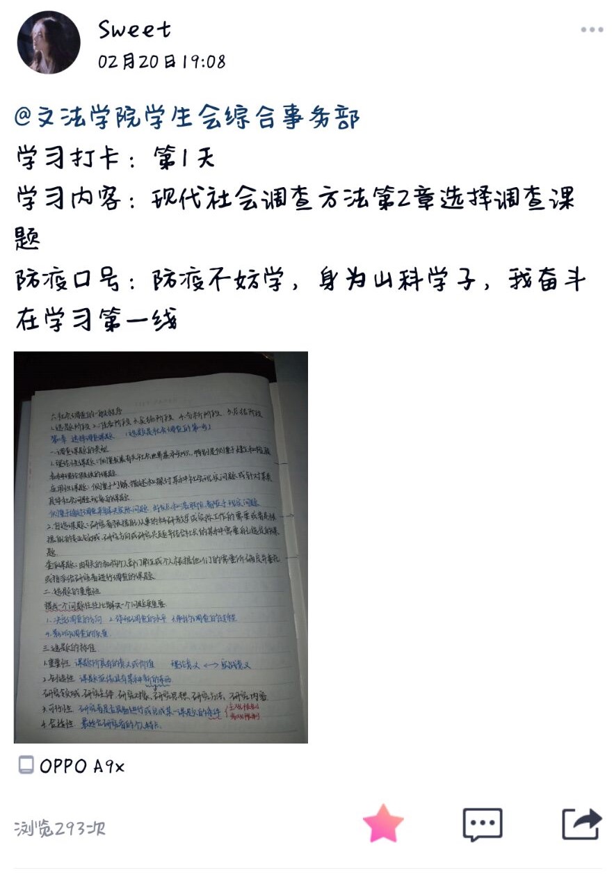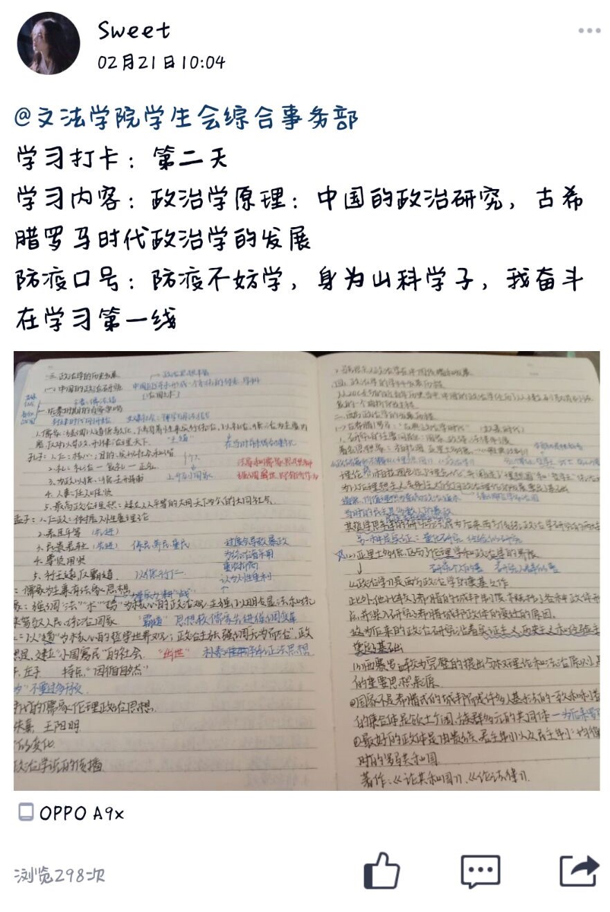 本次活动以“防疫不妨学,身为山科学子,我奋斗在学习一线”为口号,依托QQ空间、新浪微博等媒体平台,分享同学们对于专业知识、社会技能等内容的自主学习情况,并进行线上打卡签到,旨在引导同学们树立自律意识,利用好延迟开学期间的时间,激发同学们的学习动力,增进同学之间的学习交流,提高同学们在学习中的获得感。