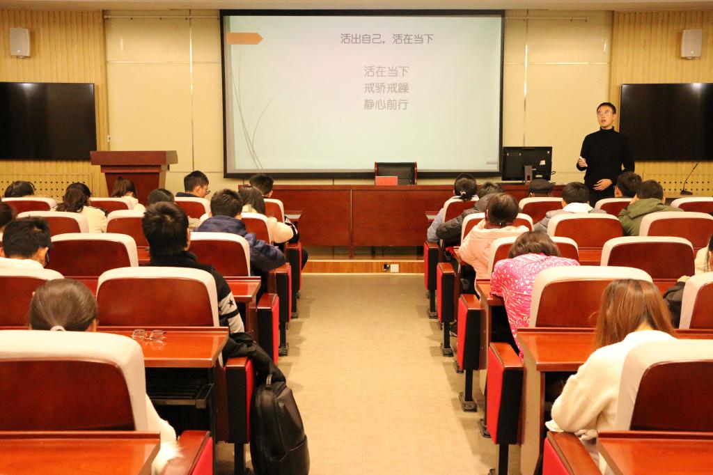 第一场讲座,孔恺臻老师首先剖析了人为什么要认识自己的问题并对人的各种性格做出详尽的解析,通过“积极想象下的对话”等小游戏为在场同学分析了性格的优缺点。随后,孔老师又介绍了强迫症、抑郁症等常见心理症状,并就如何帮助患有抑郁症同学摆脱困境进行了解答。最后,孔老师提出了活在当下、戒骄戒躁、静心前行的生活建议。同学们认真听讲,踊跃发言,现场气氛活跃轻松。