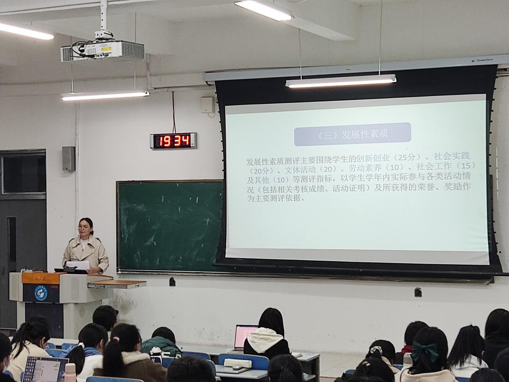 会上,郭婷婷老师围绕对围绕国家奖学金、国家励志奖学金、国家助学贷款、综合测评等方面作了详细讲解,并激励同学们自立自强、成长成才、感恩奋进,树立积极向上、刻苦努力的人生态度,从“经济资助”转向“励志强能”,争做担当民族复兴大任的时代新人。