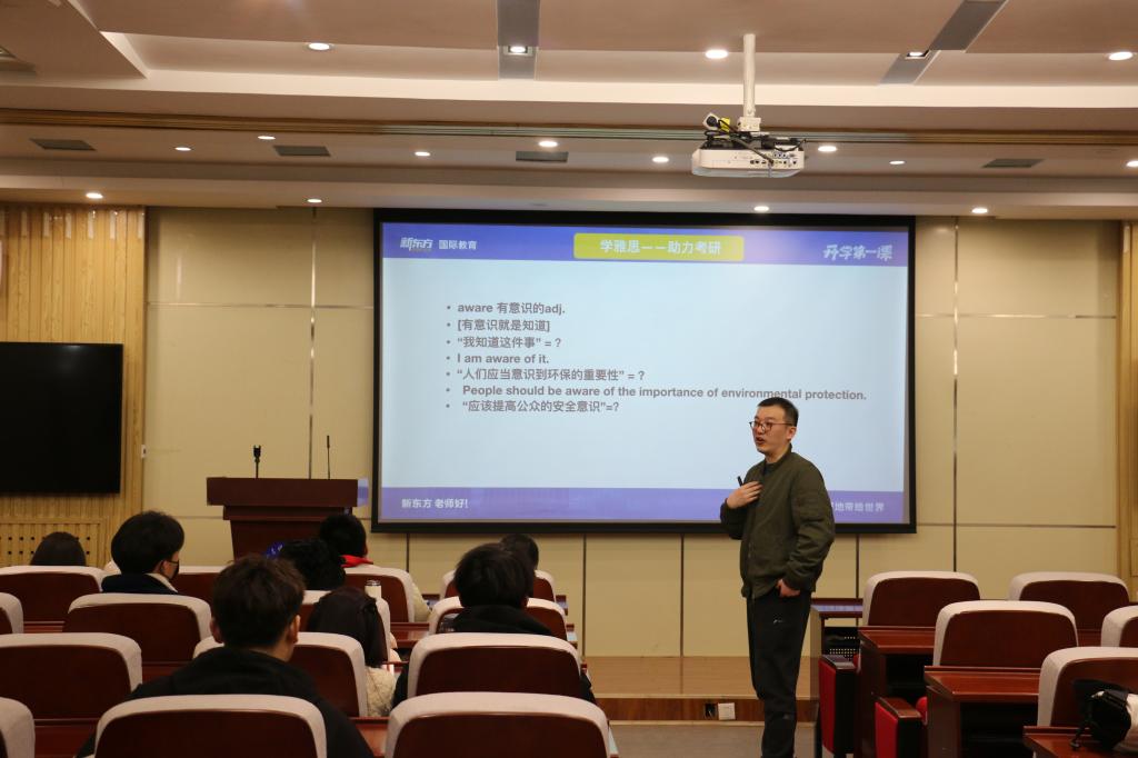 讲座中,肖老师围绕英语日常学习、考研就业以及出国留学等方面进行了细致讲解,内容涵盖如何有效提高听说读写译水平、如何有效备战考研、如何确定考研的专业方向及院校、出国留学需要考虑哪些因素等问题,对同学们从长期和短期的学习方向上进行了专业指导。讲座现场气氛活跃,同学们情绪高涨,纷纷表示会将本次所学应用于日常学习中,踏实学习英语知识,专注提高英语能力。
