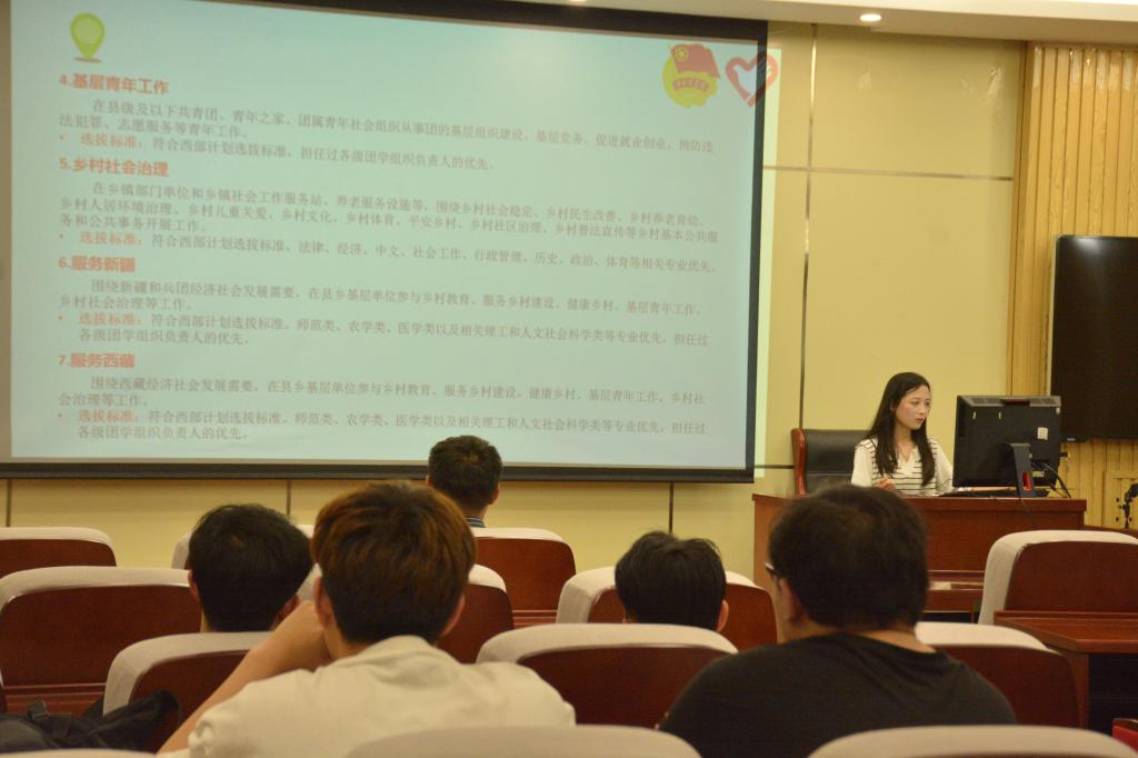 为提升大学生对西部计划的认知程度,引导和鼓励优秀老员工参与到服务基层、报效祖国的行列中来,5月15日,SUNBET申博于J9-135会议室举办了以“志愿西行,追梦青春”为主题的西部计划政策分享会。本次会议由校团委兼职辅导员刘晓晗担任主讲人。