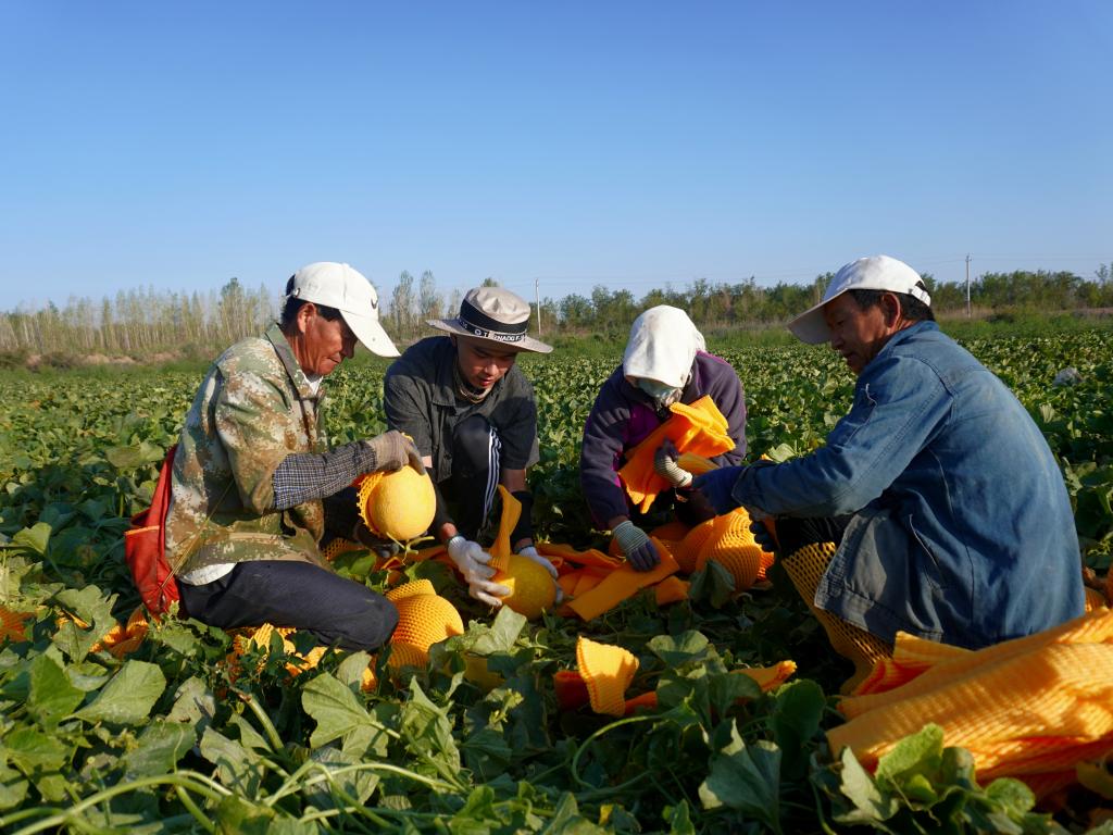 为了保证成熟瓜不受高温影响,义卖队伍成员顶着烈日和瓜农们一起采摘成熟哈密瓜,将其集中放入冷库中。
