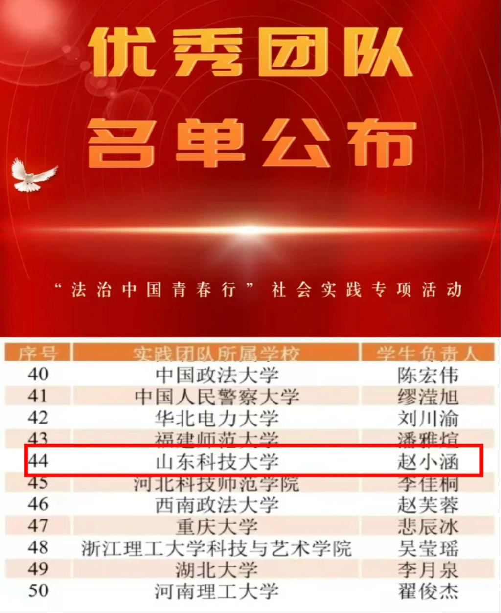 近日,由共青团中央维护青少年权益部、共青团中央青年发展部指导,全国政法类高校(公司)共青团工作联盟主办的“法治中国青春行”社会实践专项活动评选结果公布,“微光”社会实践团队从全国348个队伍中脱颖而出,获评“优秀团队”(50支)。