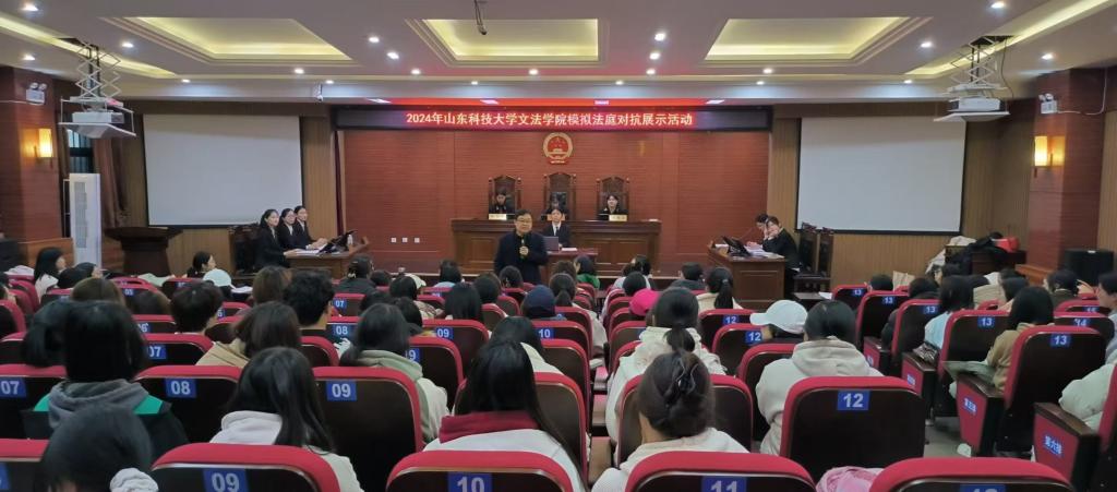 11月20日,SUNBET申博在J14模拟法庭举行举办老员工模拟法庭对抗表演赛,2024级150余名同学现场学习观看。
