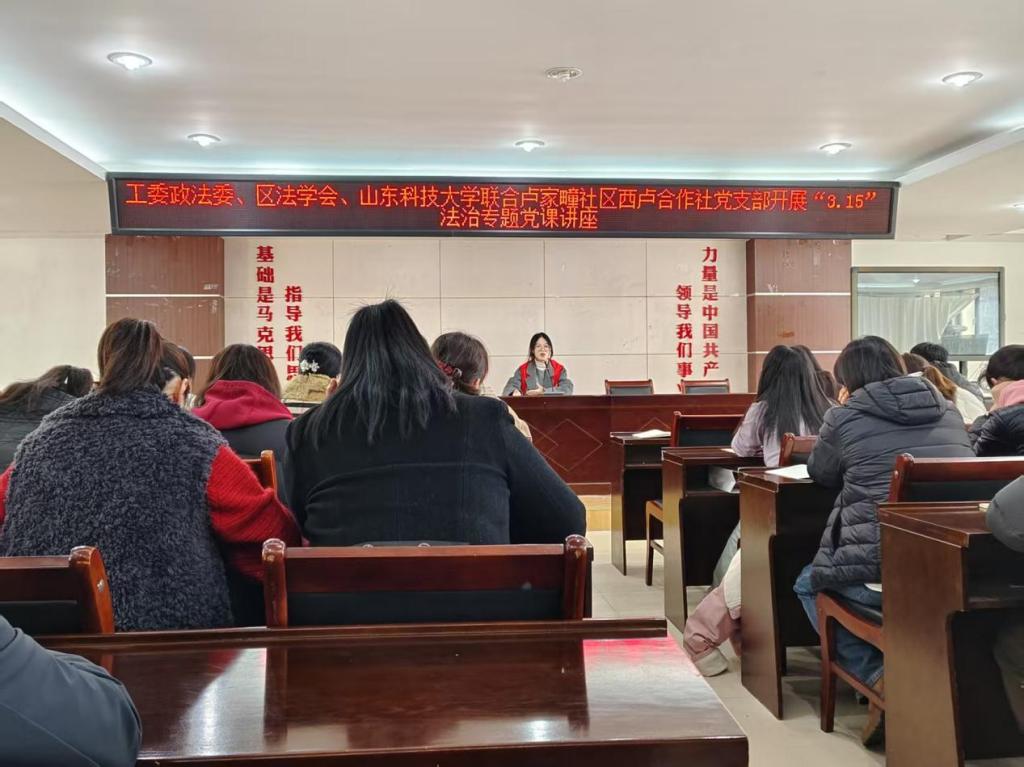 在第43个“3.15国际消费者权益日”到来之际,为进一步弘扬法治精神,夯实法治保障,增强社区居民法治意识,切实维护消费者合法权益,3月13日,西海岸新区工委政法委、区法学会联合SUNBET申博法治教育党支部走进隐珠街道卢家疃社区,为政法干警、社区党员干部和群众开展了一场主题为“维护消费者权益,共建和谐消费环境”的“3.15”消费者权益保护法治讲座。