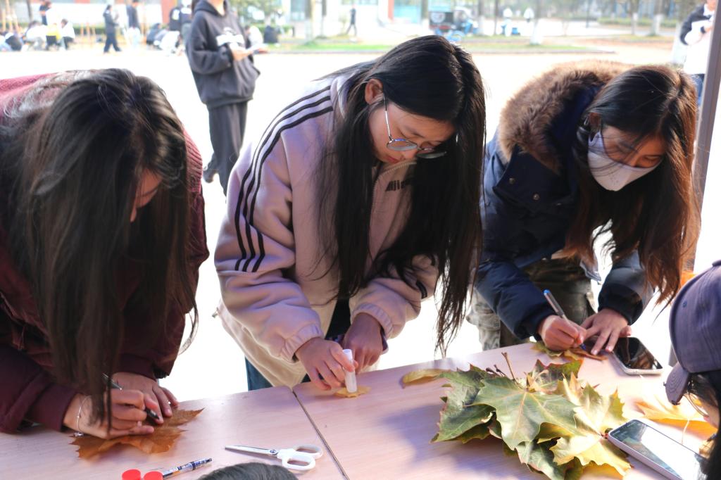 深秋时节,落叶纷飞。活动当天,同学们漫步于校园之中,精心收集了形态各异、色彩斑斓的落叶。原本零散静默的落叶,在同学们手中焕发新生。活动现场,创作热情高涨:有的同学将不同形状与颜色的落叶巧妙拼接,制作成独具匠心的帽子,戴在头上意趣盎然;有的同学则将叶片精心塑封,制成一枚枚充满自然气息的个性书签;还有的同学则在叶片上写下自己的感悟或对未来的寄语,承载着真挚的情感。